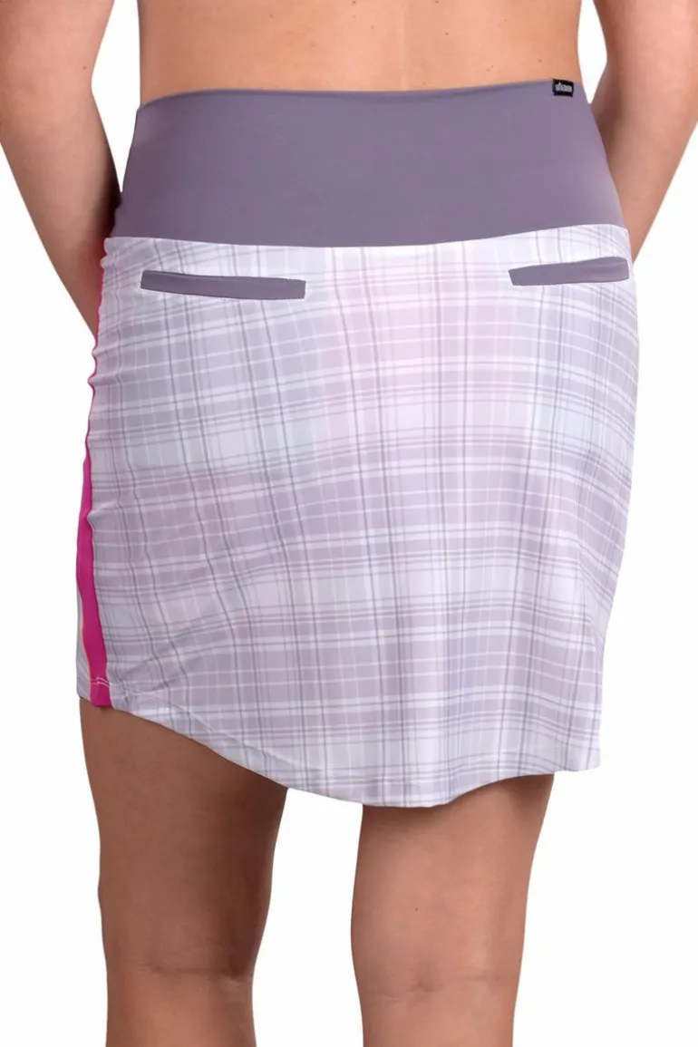 This cheery Alura skort has many features. Large oversized 4 inch waistband and attached fitted undershorts hug all your curves. The grid print is highlighted with orange and pink side paneling.