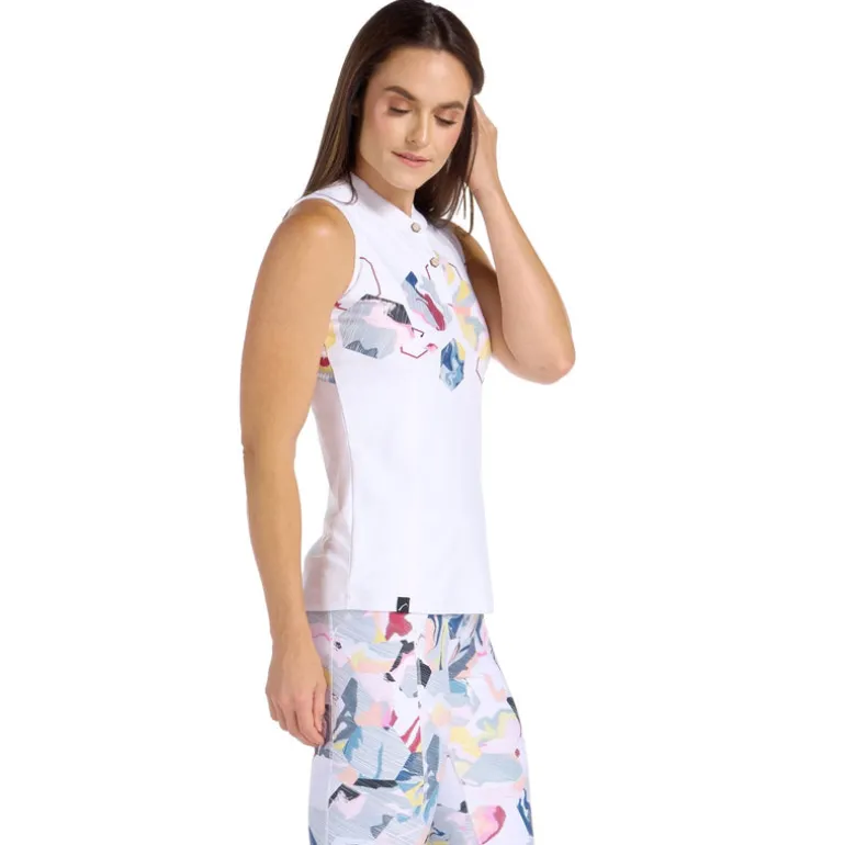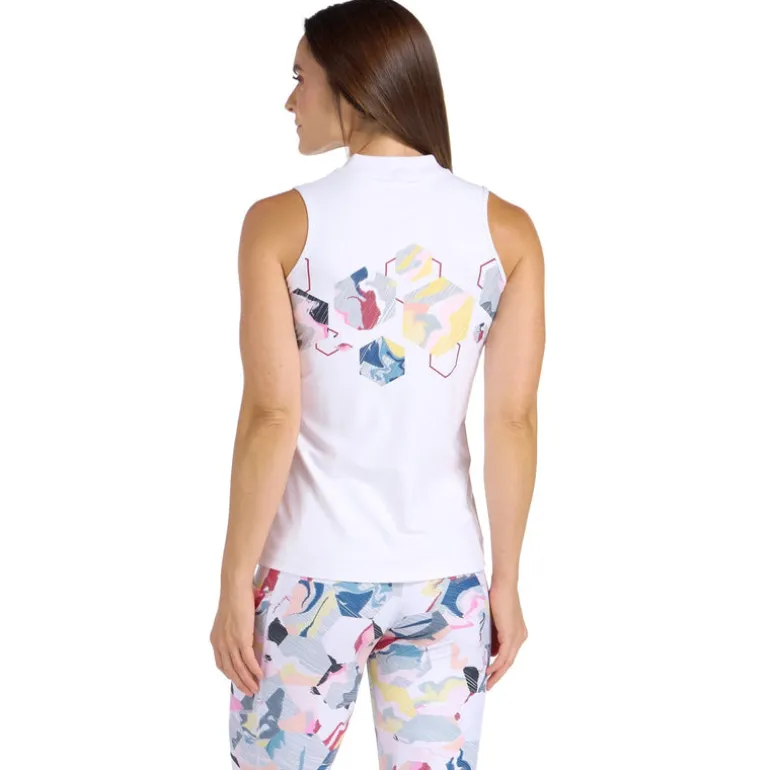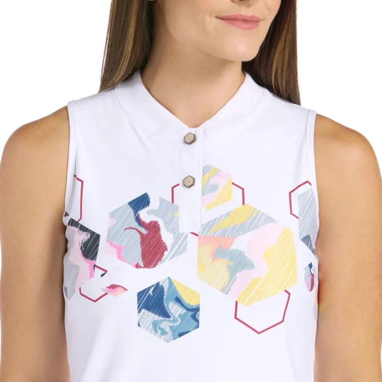 Sporty and posh this timeless white sleeveless top with our Hexagon print is featured in a lightweight breathable fabric. Adorned with two Hexagon marbled snaps on the placket.