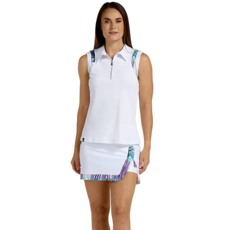 Our Pearl sleeveless top in white boasts a pointed-edge rolled collar and a zip placket. Accented fabric inlays provide a pop of unexpected style.
