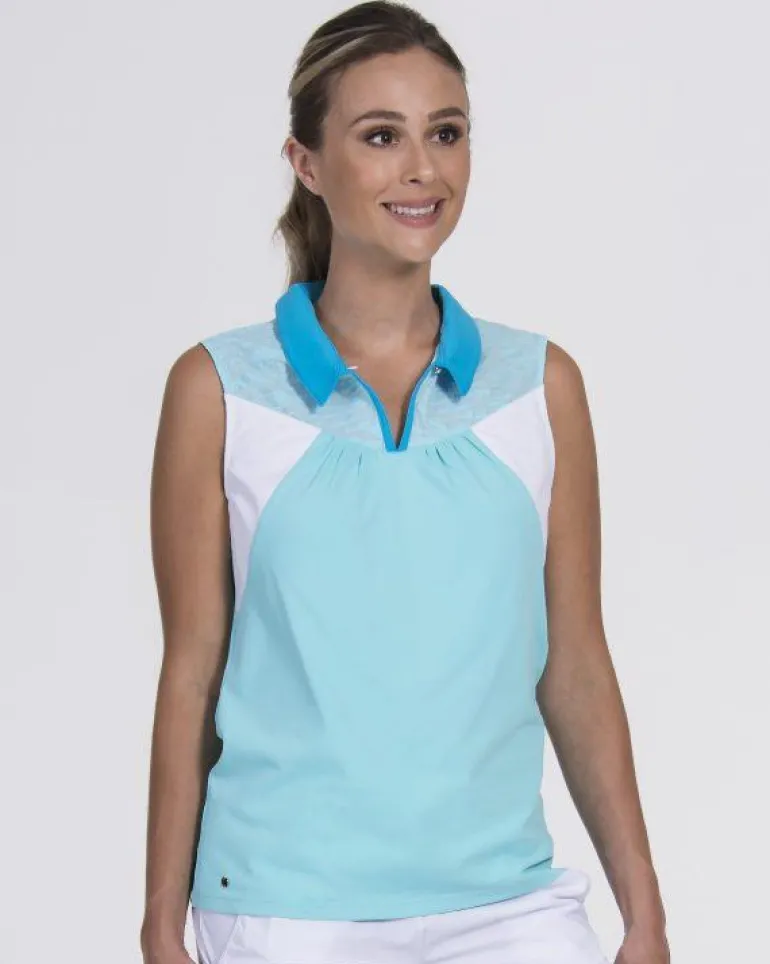 Slip on this SwingDish bright blue athletic Resort Sleeveless Polo from our Resort Collection. Between the unique razorback and the flow of the fabric, you will be hooked. It also has a beautiful button closure, or you can leave open for a V neck look.