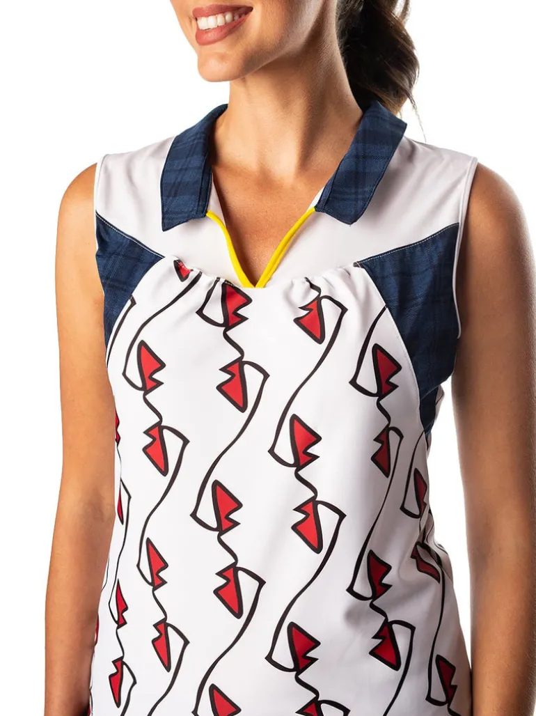 Let the sun kiss your shoulders in this Lip printed sleeveless Savannah top. The v-neck and roll collar adds sophistication. Enjoy a day on the course feeling cool, fresh and comfortable. Designed to fit any lifestyle this top will make everyone green with envy.