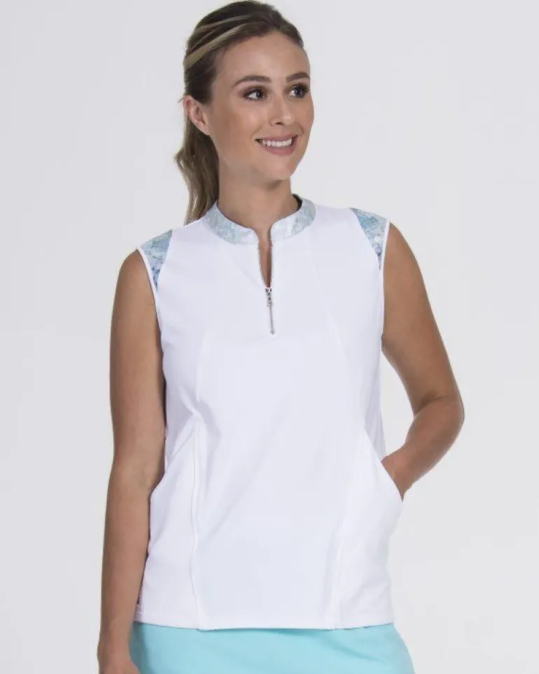 This SwingDish Resort Signature Sleeveless golf polo from our Resort Collection has classic lines with hidden front pockets. Enjoy this piece out on the green or out at lunch!