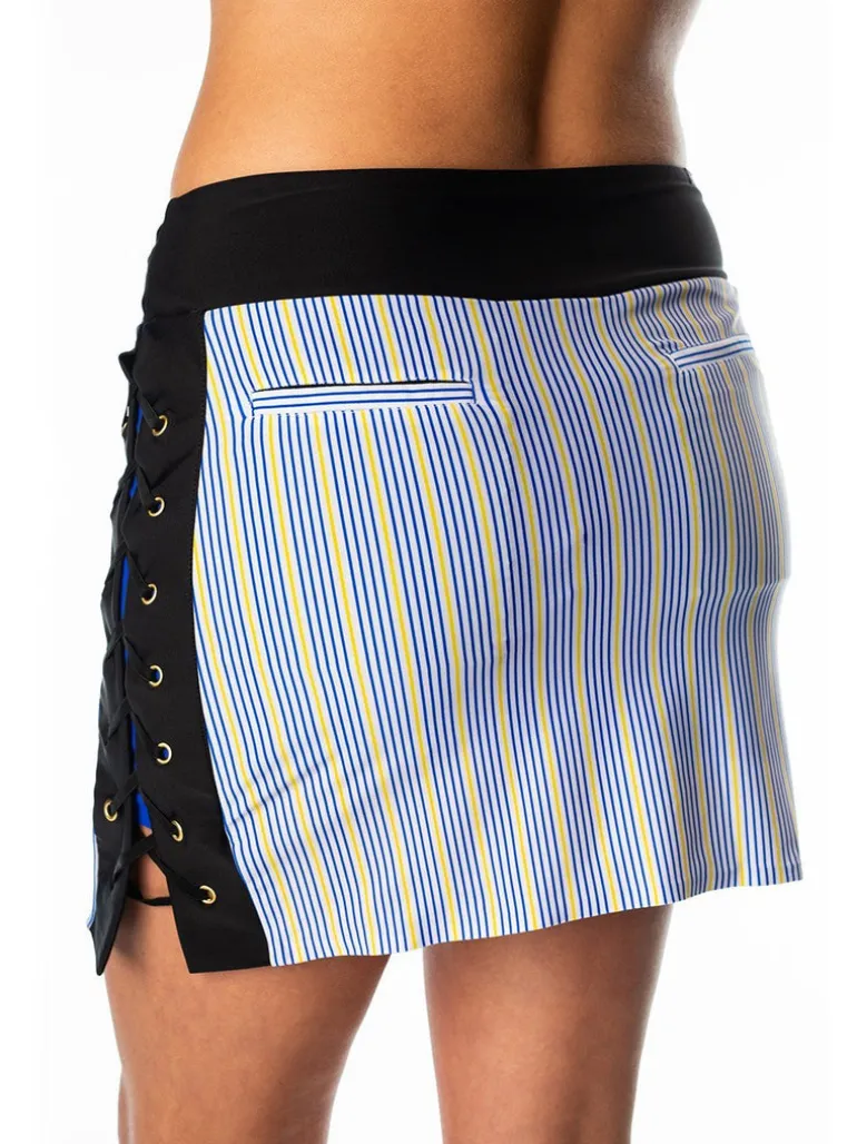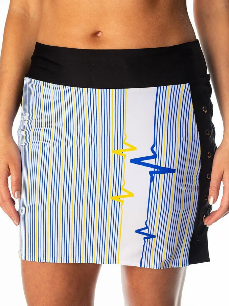 Striking details and slimming print on this Zoey fitted skort flatter your every move. Gold grommets and lace up detail on the side seam with peek-a- poo color is unique and trendy. Performance fabric keeps you cool and dry and ready for the next event.